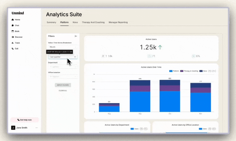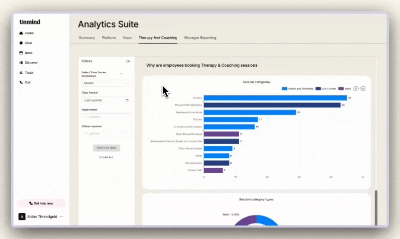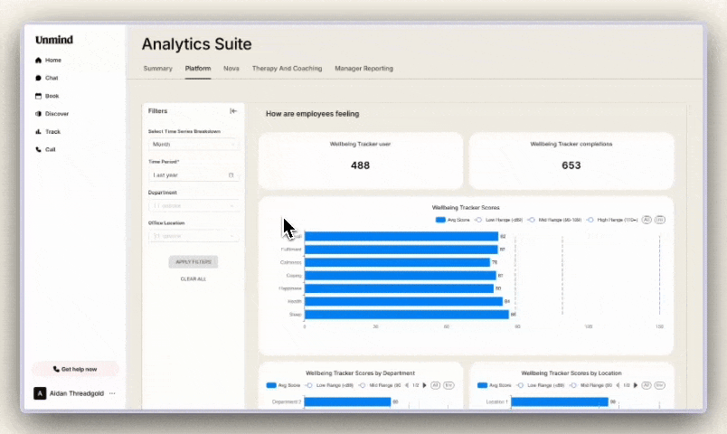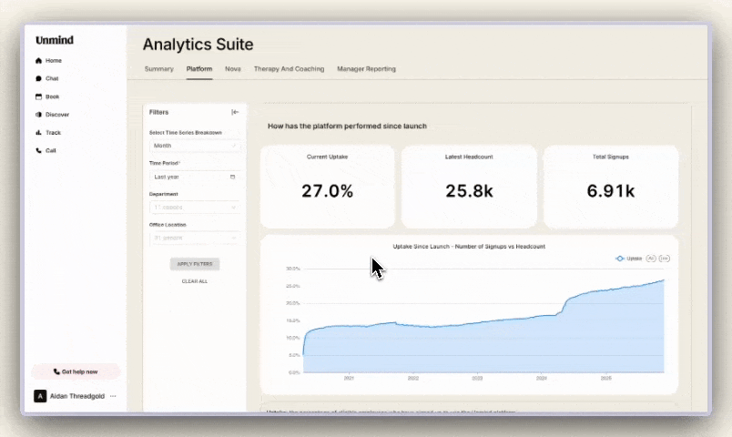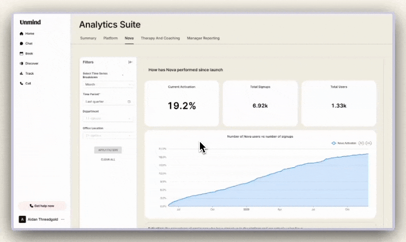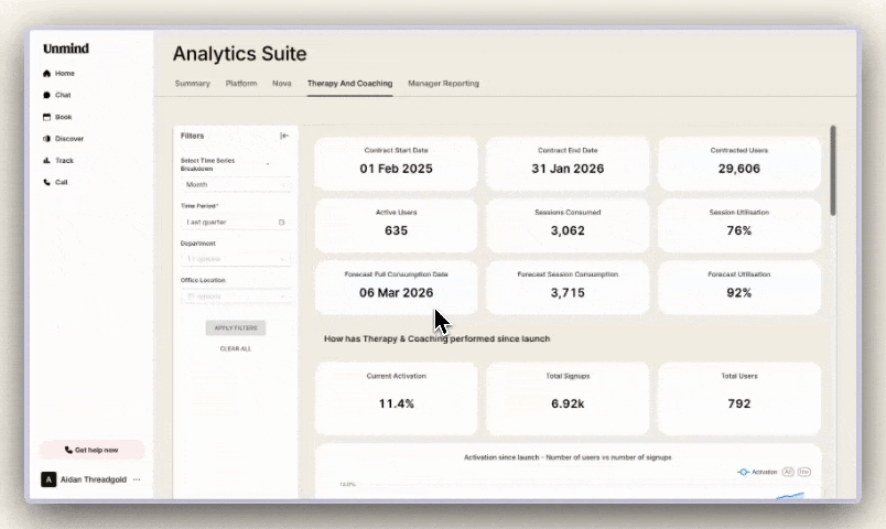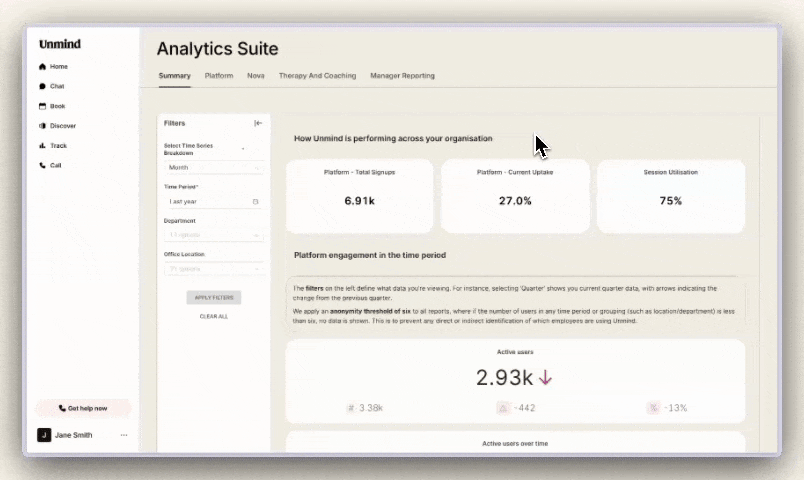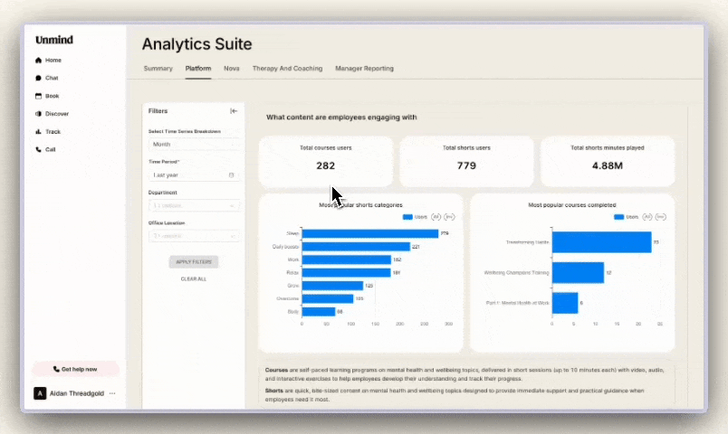 The Unmind Analytics Suite provides Admin users with real-time, self-serve visibility into meaningful data across your organisation's Unmind platform. This gives you instant access to performance metrics for Platform, Nova and Therapy & Coaching.