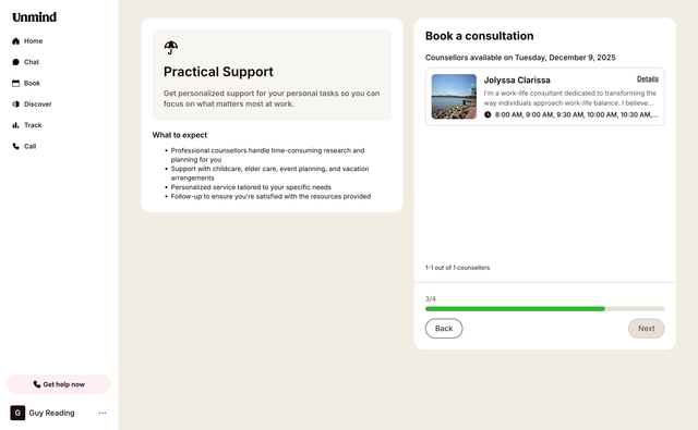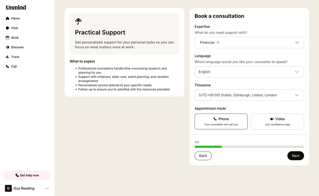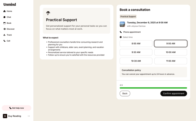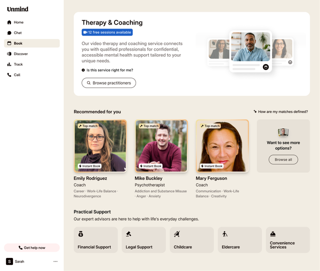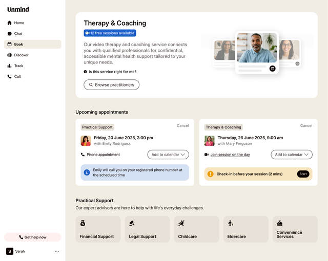 Please note: If your organisation provides Unmind's Therapy & Coaching service, you'll see those options at the top of your Book page. Practical Support services from our partner will appear below.