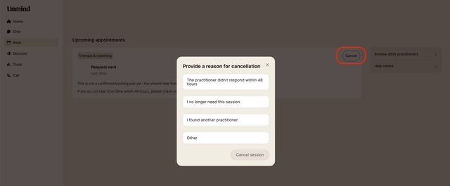 To use this feature, open Unmind, navigate to Book, click on Edit in the top right-hand corner of the session details box, and select Cancel. Make sure to provide a reason for the cancellation.