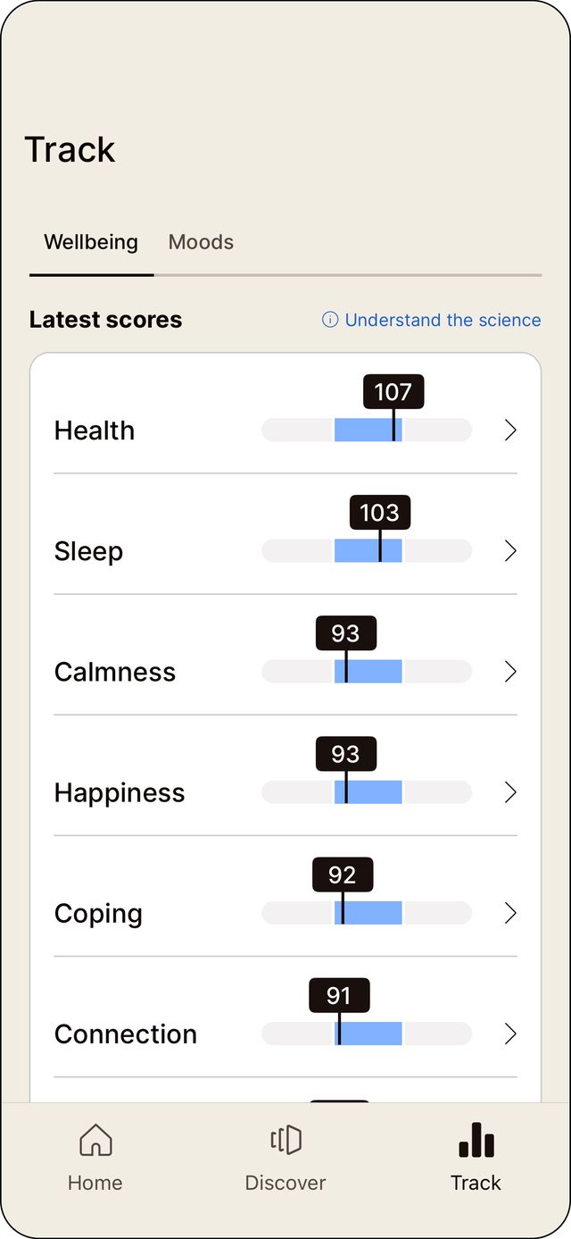 Using the Track feature allows you to capture the core areas of wellbeing and helps identify those that need the most attention. Tracking your mood helps you measure your progress, spot trends and make informed choices about how to boost your mental wellbeing.