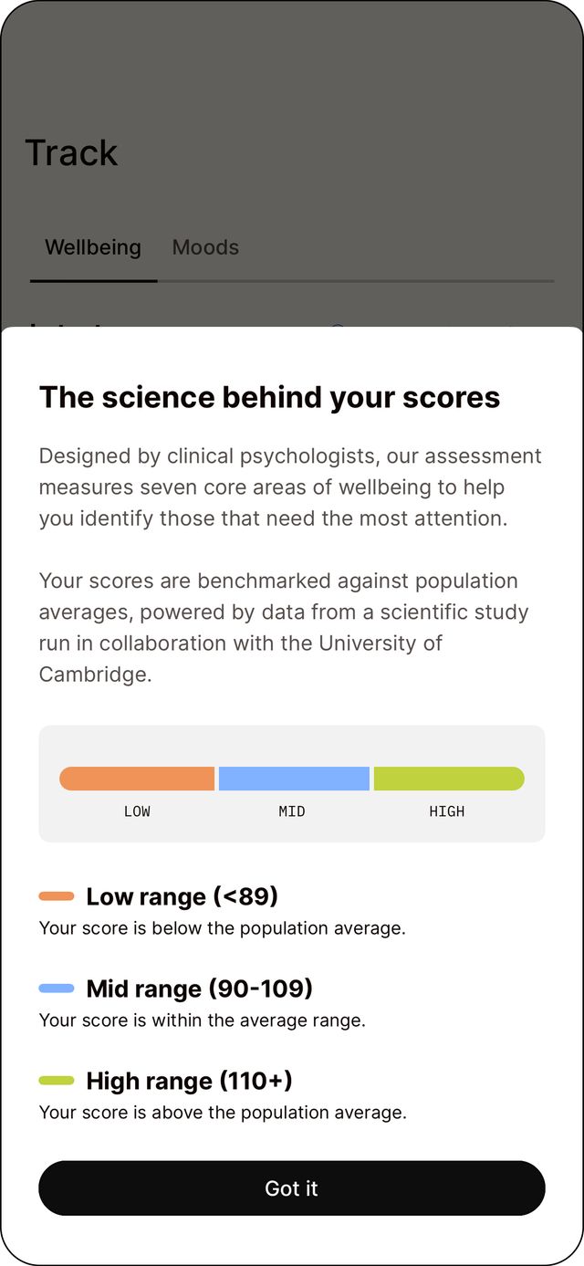 Measure your wellbeing using our Track feature, designed by specialist clinical psychologists and validated by expert statisticians.