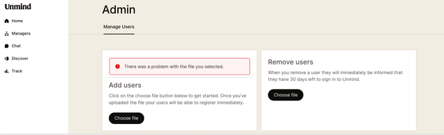 To remove users, upload your .csv file containing the users you would like to Remove by clicking on Choose file. Select your file from your system and wait for it to process.