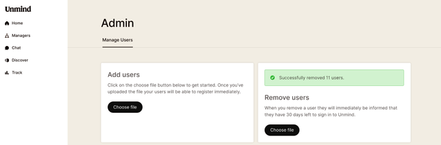 Please note: once you have removed a user they will still have 30 days access to Unmind to serve as a cooling-off period and will receive an email notification letting them know this. Beyond 30 days, personally identifiable information will be sanitised from our system.